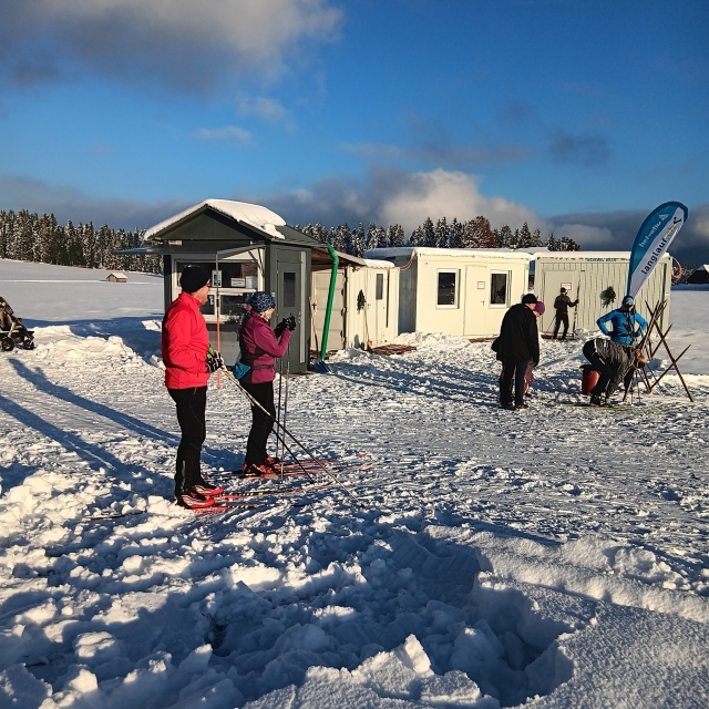 Wir öffnen das Kassenhüsli und die Skiausrüstung kann auch gemietet werden etwa ab 10.30 Uhr. Die Loipe wird maschinell präpariert inkl. die klassische Spur.